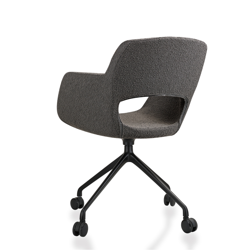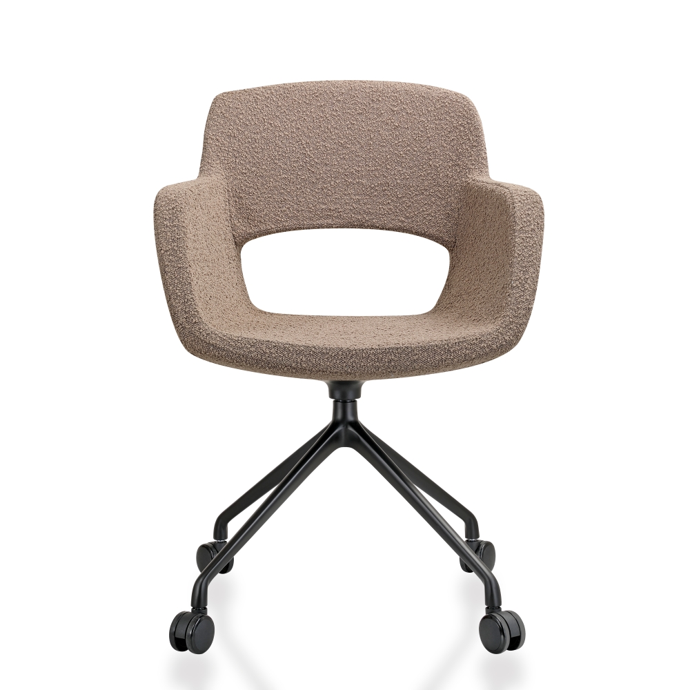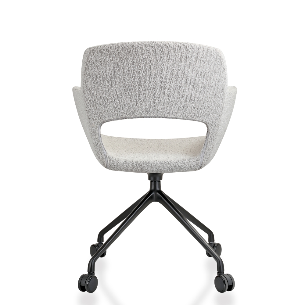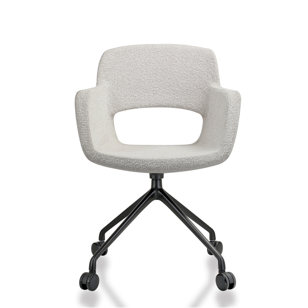 Trendy vergaderstoel op wielen voorzien van een boucle stoffering.
