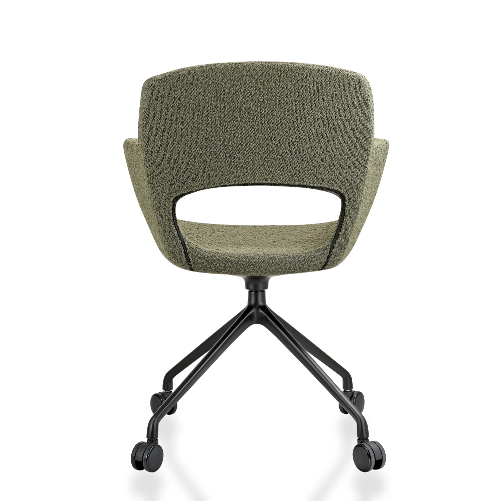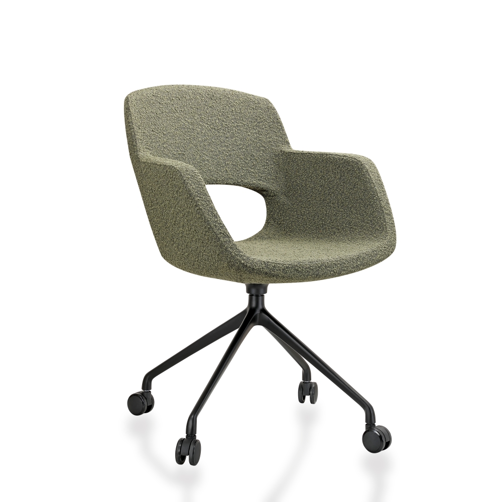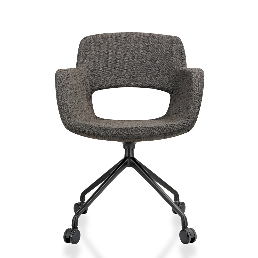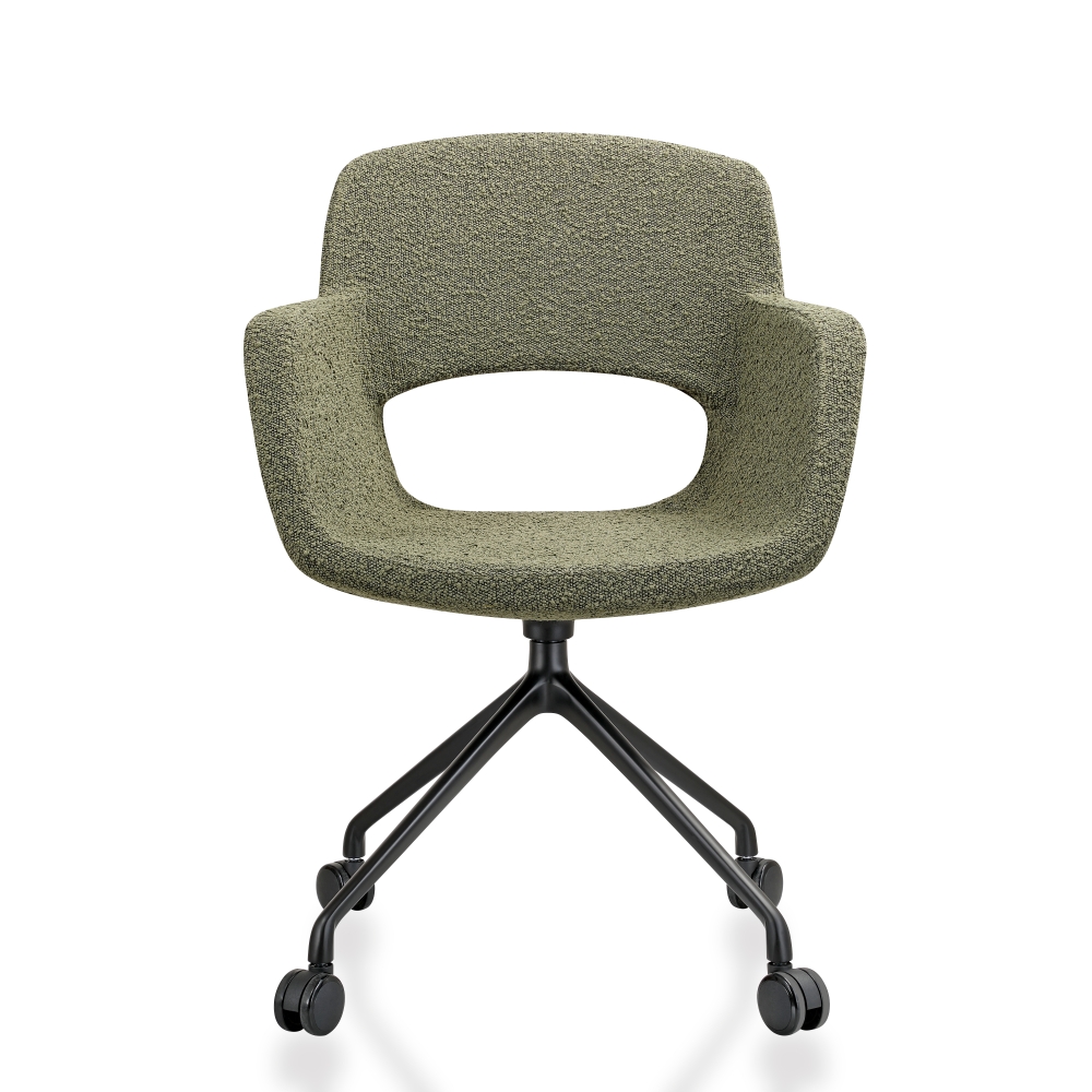 Trendy vergaderstoel op wielen voorzien van een boucle stoffering.