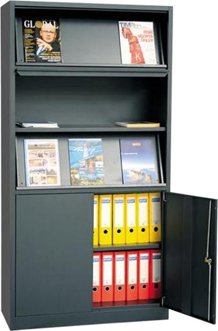 Folderkast met onderkast in 5 verschillende kleuren. Perfecte werking van het klapsysteem van de 3 schuine legborden door middel van gelagerde wieltjes. Royale opbergruimte achter de schuine legborden en onder in de kast.
