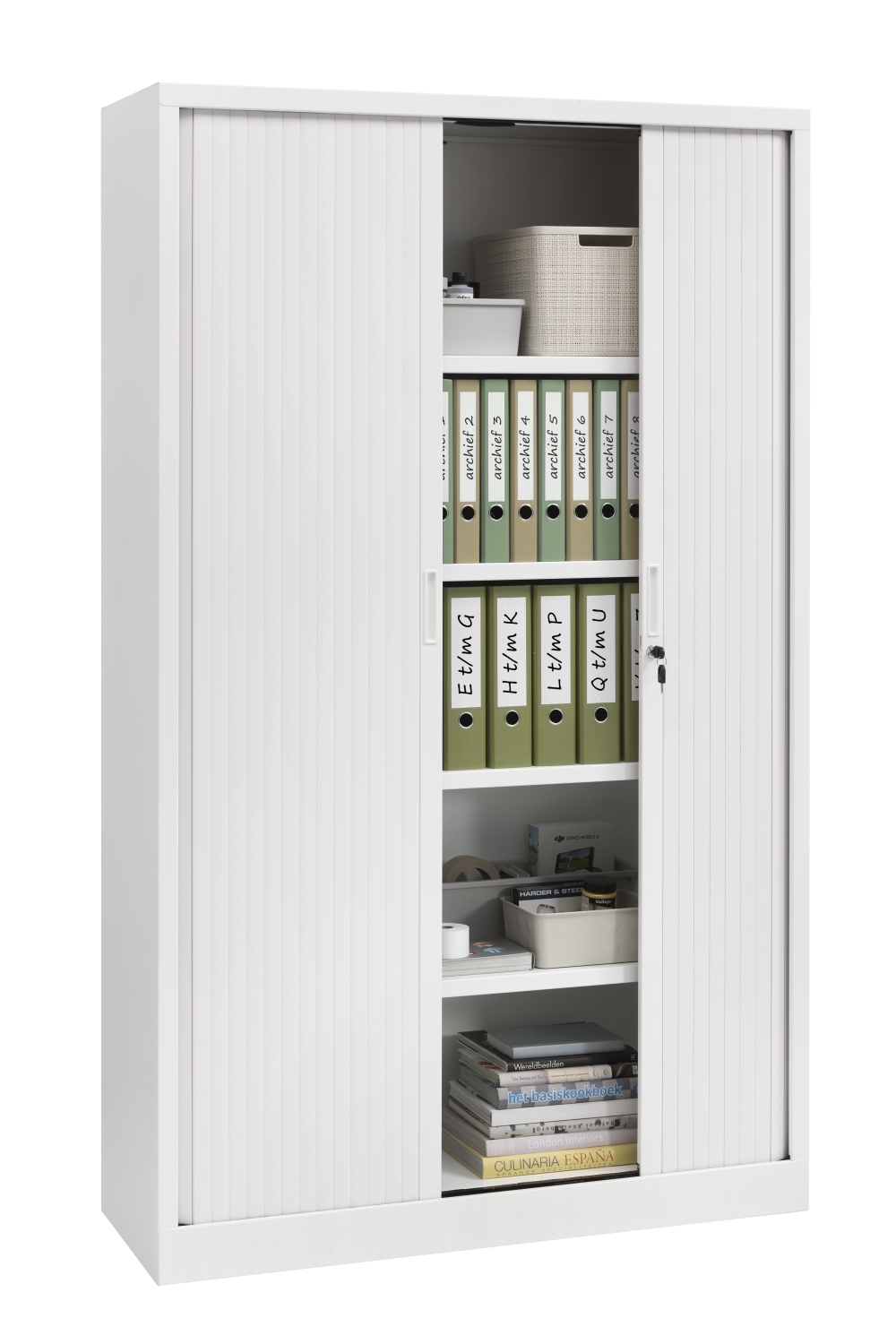 Legborden (in de zelfde kleur als de ombouw van de kast) zijn op elk gewenste hoogte te monteren en tevens geschikt voor A4 laterale hangmappen